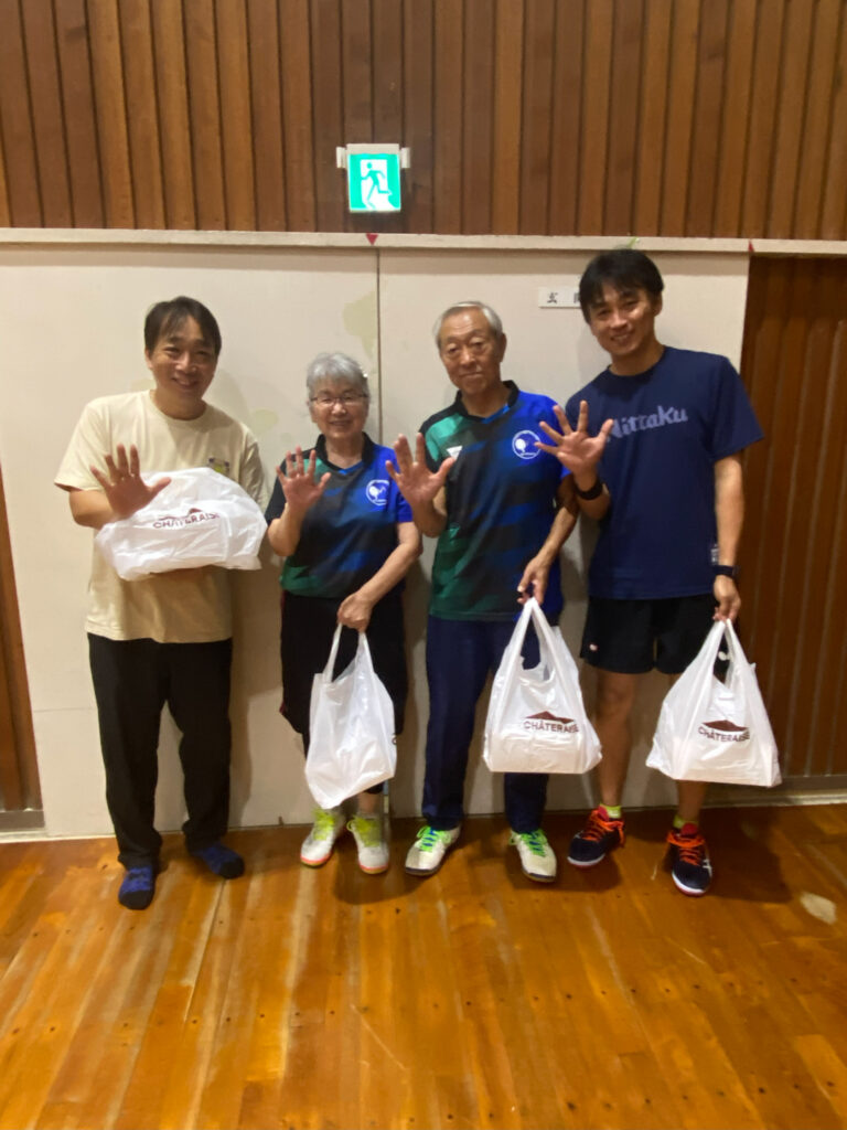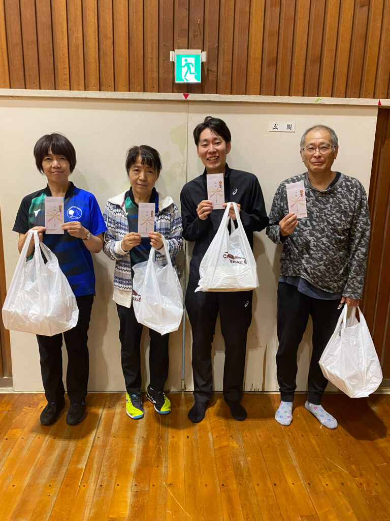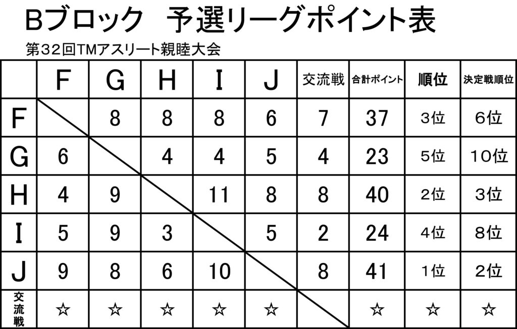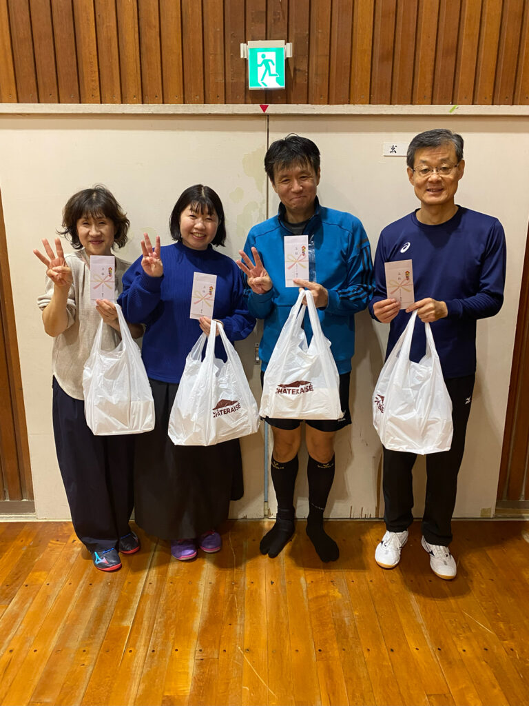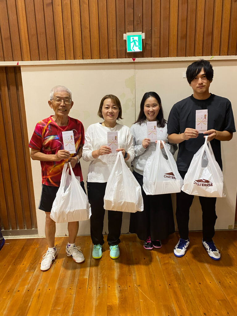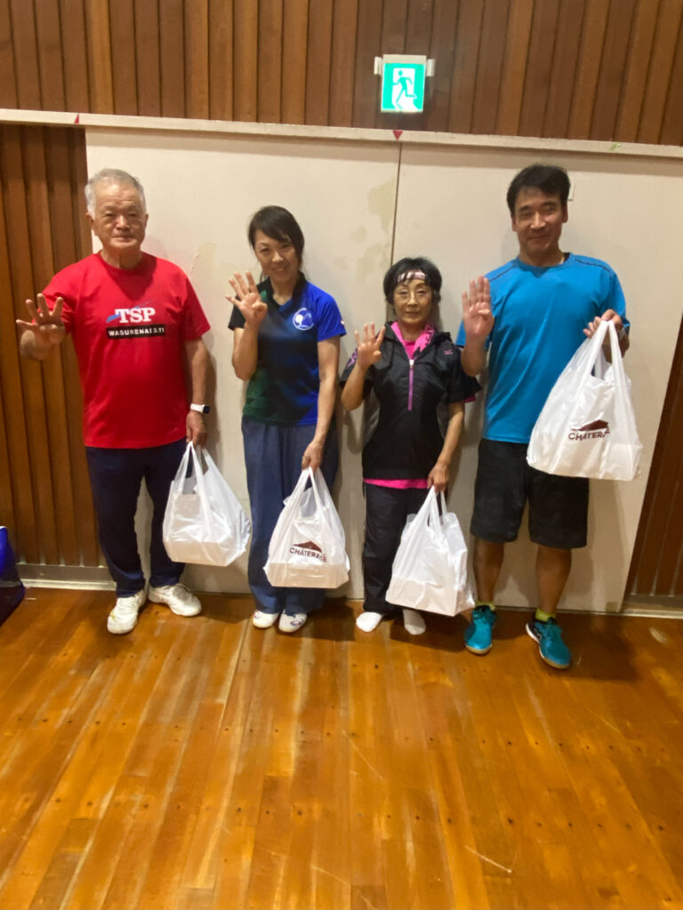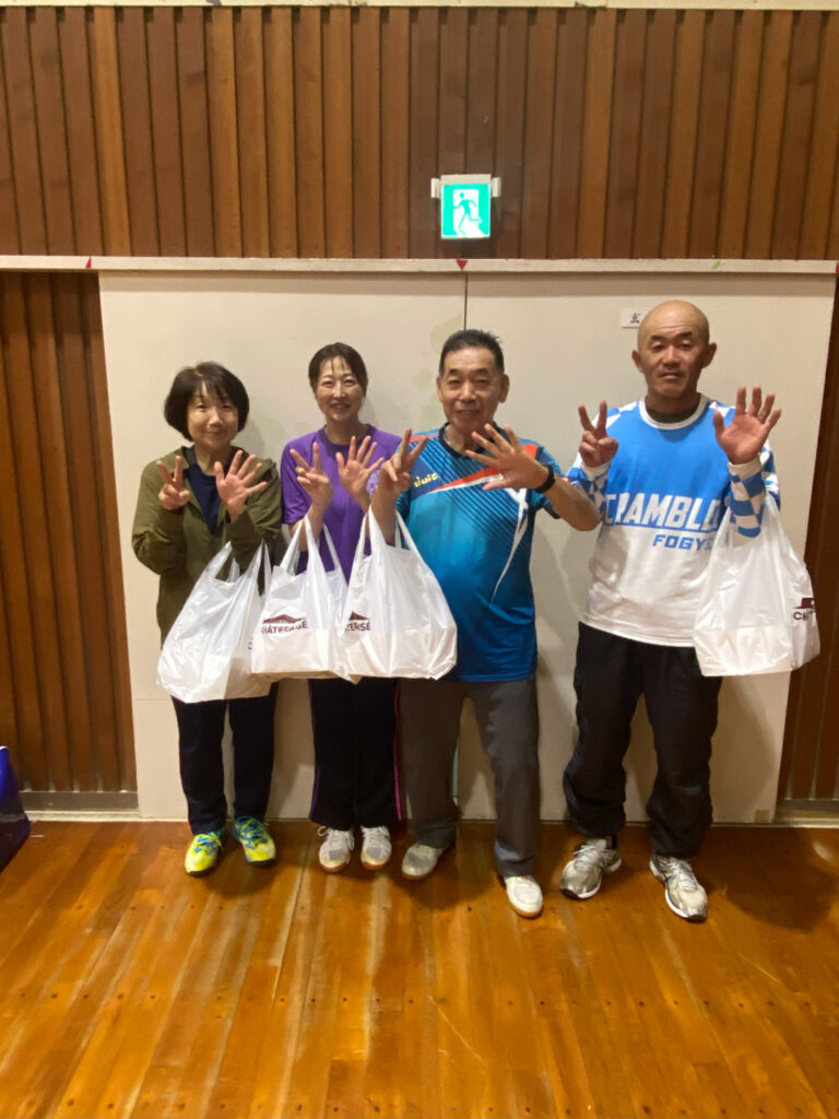 令和7年 10月19日 第32回親睦大会 NEW!! , 大会結果 , 親睦大会 207 views 第31回親睦大会・総勢40名の参加者を4人1チームとしてAブロック5チームBブロック5チームに分けて予選リーグを行い順位確定後、同率チーム同士で決定戦を行いました。 1位 45ポイント Dチーム 2位 41ポイントEチーム 3位 40ポイント Hチーム 4位 37ポイント Bチーム 5位 37ポイント Aチーム 7位 35ポイント Cチーム ブービー賞 17ポイント Eチーム 特別賞